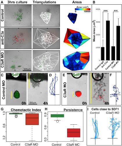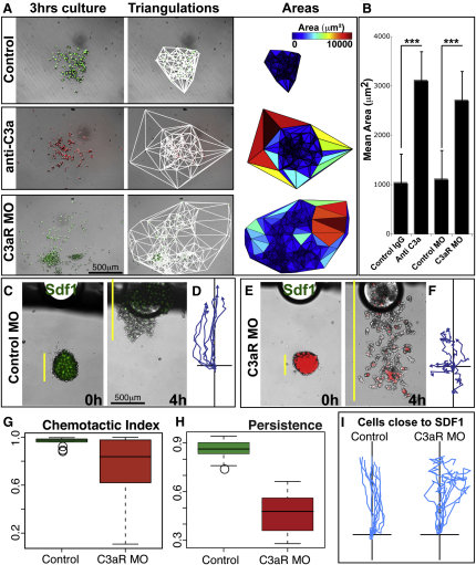 Figure 5. C3a/C3aR Loss of Function Leads to Increased NC Dispersion and a Concomitant Poor Response to External Signals(A) Delaunay triangulations (center) of NC explants after 3 hr of culture (left) show enhanced dispersion after C3a/C3aR loss of function as areas in between neighbors are increased (right).(B) Quantification of many explants (triplicates with n > 10, each) shows that this effect is consistent and significant (∗∗∗p < 0.001).(C–I) Response toward Sdf1. Control NC cells respond uniformly to an Sdf1 source (C), whereas C3aR MO cells respond heterogeneously (E). (D and F) Tracks represent the displacement of rear cells. Box plot showing the distribution of chemotaxis indexes (G) and persistence (H). Note that some C3aR cells respond as good as control cells, but they are much more heterogeneous as a group. (I) Tracks for control and C3aR MO cells near the Sdf1 source, showing that both cells are able to sense Sdf1.Error bars in (B), (G), and (H) correspond to the standard deviation from the mean. See also Movie S6. |