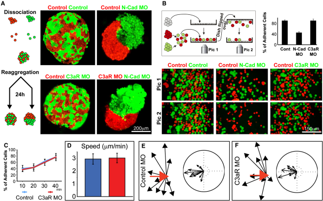 Figure 6. C3a/C3aR Do Not Have a Major Effect on Cell Adhesion, Motility, or CIL(A) Cell-sorting assay to estimate differential cell-cell adhesive properties. Dissociated cells were reaggregated and cultured for 24 hr before analysis. As expected, NC cells labeled with two different colors mix with each other because they show equal adhesive properties. As a positive control for cell sorting, control NC cells were mixed with N-Cadherin morphant NC cells. Clear cell segregation is observed. However, C3aR MO does not affect cell sorting of NC cells because morphant cells mix perfectly with control and segregate from N-Cad MO NC cells.(B) Cell-cell adhesion assay. NC cells were cultured as a monolayer on fibronectin (gray cells). Control (red) and treated (green) NC cells were dissociated, mixed, and seeded on the NC monolayer. After 3–5 min, the dish was flipped over, shaken, and the number of remaining cells was counted. Pictures were taken before (Pic 1) and after (Pic 2) the dish was flipped over. Most of the control cells remained adhered to the NC monolayer; however, a large proportion of the N-Cadherin MO cells was lost, indicating a decrease in NC-NC adhesion in the N-Cadherin depleted cells. C3aR MO cells remained adhered to the NC monolayer, suggesting no major effect on cell-cell adhesion.(C) Quantification of the adhesion to substrate assay. Control (blue) or C3aR MO (red) NC explants were cultured on fibronectin, and the culture dish was flipped over at the indicated times. The percentage of adhered explants was then quantified. Standard deviation was obtained from three independent experiments (p > 0.05).(D) Cell motility is not affected by C3aR MO as single control (blue bar), and C3aR MO (red bar) cells show the same speed of migration.(E and F) Control and C3aR MO NC cells have normal CIL. Confrontation of NC explants to measure CIL was performed as described (Carmona-Fontaine et al., 2008). Red arrows show velocity vector before collision; black arrows indicate velocity vector after collision. Cluster of acceleration vectors is not changed by C3aR MO, indicating that CIL if not affected.Error bars in (B) and (D) correspond to the standard deviation from the mean. |