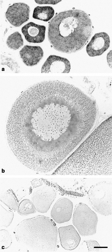 In this paper, a cDNA homologous to the mammalian ribosomal protein (r-protein) L34 was isolated from a Xenopus laevis oocytes library and named XL34. It encodes a protein of 116 residues with an Mr of 13.2 kDa and a highly basic sequence. The nucleotide (nt) and deduced amino acid (aa) sequence have been compared with the L34 sequence from other species. This analysis showed that the L34 is a protein greatly conserved from prokaryotes to eukaryotes.XL34 mRNA is abundantly present in the whole cytoplasm of oocytes at stages 1 and 2.
