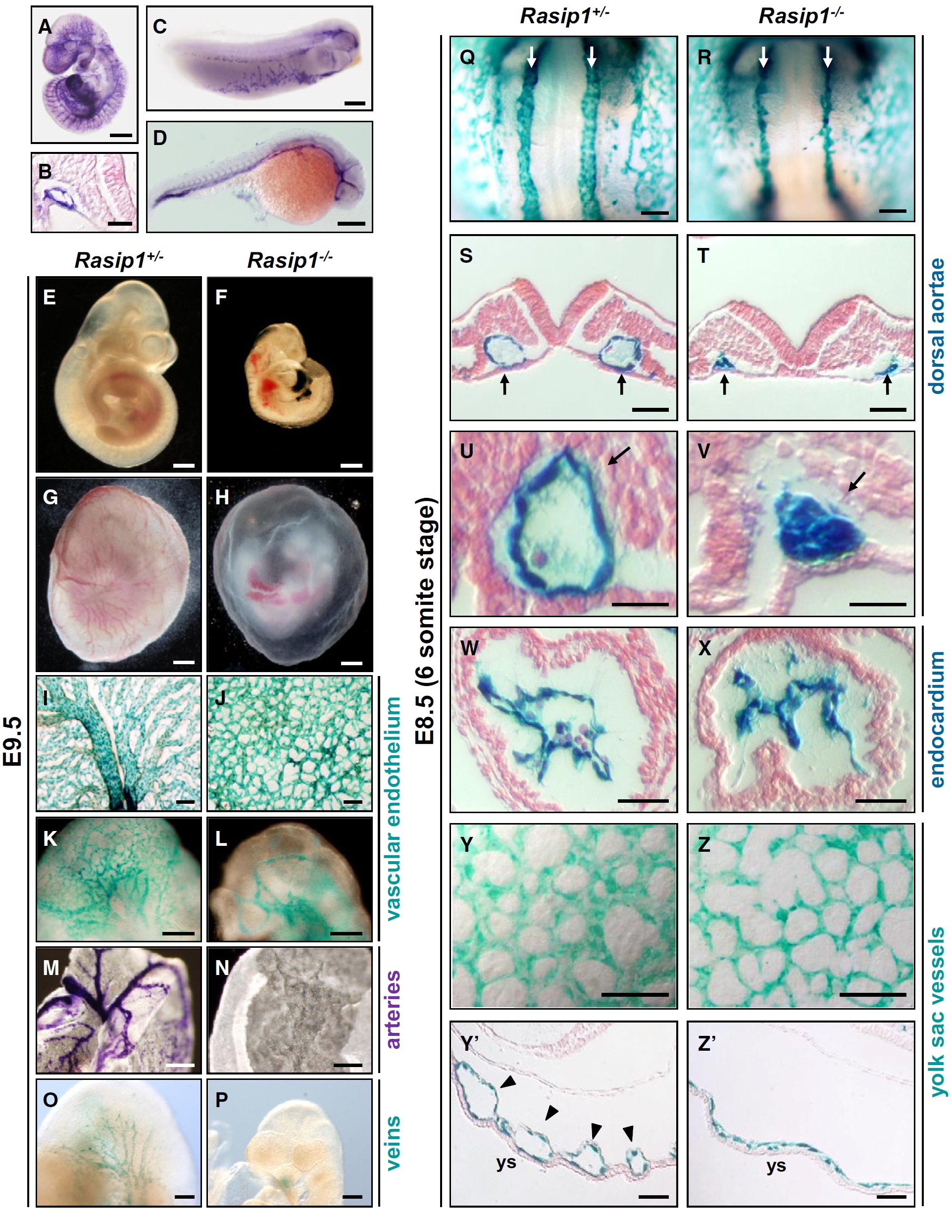 (E�H) E9.5 littermate mouse embryos showing defects in Rasip1 / embryos (F) and yolk sacs (H).