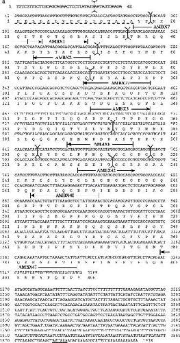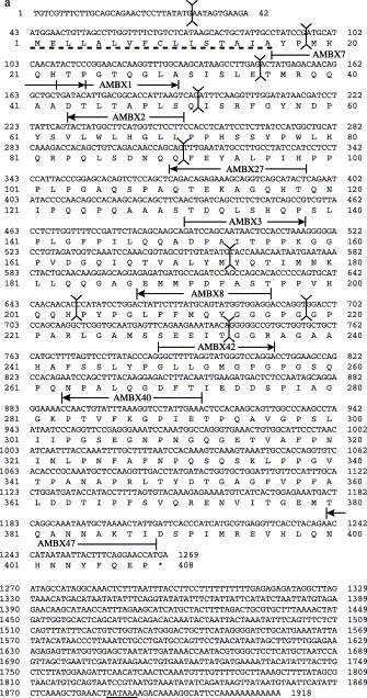 Nucleotide and translated amino acid sequences of toad AMBN cDNA clones. Amino acid residues are given in the IUPAC-IUB single-letter code and the signal peptide is underlined with a dotted line. The stop codon is indicated by an asterisk (*) and the polyadenylation signals are underlined with a solid line. Primer positions and orientations are indicated by lines with arrowheads above their locations in the sequence. Vertical lines show the positions of the exon boundaries. (a) toad-A gene; (b) toad-B gene. The sequences can be accessed in the GenBank database under accession nos. AY181985 and AY181986.