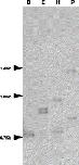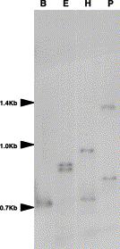 Southern blot analysis of the toad AMBN genes. Toad genomic DNA was digested with BamHI(B), EcoRV(E), HindIII(H) and PstI(P) restriction enzymes, and hybridized with the toad AMBN cDNA probe.