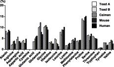 Comparison of the amino acid composition of the deduced toad AMBN proteins with that of human, mouse and caiman AMBN proteins. Analysis for the secreted proteins was conducted after elimination of the signal peptides.