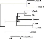 Ameloblastin (AMBN) is an enamel sheath protein that presumably has a role in determining the prismatic structure of growing enamel crystals. To investigate the relationship between the molecular evolution of the AMBN gene and development of enamel prismatic structures, it is considered to be of great significance in the identification of homologues of the AMBN genes in nonmammals whose teeth lack an enamel prismatic structure. Several clones containing AMBN cDNA were isolated from an African clawed toad tooth cDNA library by screening with a polymerase chain reaction (PCR) method. Sequence analysis of the clones revealed that they were derived from different genes (toad-A and toad-B), which were found to contain ORFs encoding 408- and 352-amino-acid proteins, respectively. The N-terminal part of the toad AMBN proteins and the phosphorylation motif for casein kinase II, as well as several features, were found to be highly conserved throughout the evolution of tetrapods. Exon-intron boundaries were shared by toad and caiman genes with the exception of exons 6, 7 and 10 while human and caiman genes shared them exclusive of exons 8 and 9 which have been found only in the human. As for exon 7, it was absent in both toad genes. Moreover, the AMBN genes were transcribed only in the upper jaw, presumably in teeth. These results may provide useful information for investigation of the evolution of enamel.