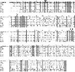 Amino acid sequence alignment of AMBNs from human, cattle, pig, rat, mouse, caiman and toad specimens. Amino acid residues are given in the IUPAC-IUB single-letter code. Numbering shows residue positions. Identity with the simple majority consensus sequence at the top is indicated by a dash (–) and deletions introduced for optimal alignment by asterisks (*). Potential phosphorylation residues (PK C, protein kinase C; TK, tyrosine kinase; CK 2, casein kinase II) are indicated by arrowheads. Vertical lines indicate exon borders of the human, caiman and toad AMBN genes. Parts completely identical in tetrapods are indicated by shaded boxes.
