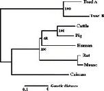 Neighbor-joining tree of amino acid sequences of AMBN proteins. The scale bar represents the distance based on the proportion of amino acid differences. Gapped sites were removed from all sequences before distance estimates were made. Numbers on the nodes indicate the percentage recovery of that node in 1000 bootstrap replications.