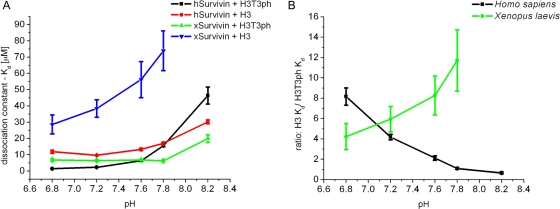 Survivin, a subunit of the chromosome passenger complex (CPC), binds the N-terminal tail of histone H3, which is phosphorylated on T3 by Haspin kinase, and localizes the complex to the inner centromeres. We used x-ray crystallography to determine the residues of Survivin that are important in binding phosphomodified histone H3. Mutation of amino acids that interact with the histone N-terminus lowered in vitro tail binding affinity and reduced CPC recruitment to the inner centromere in cells, validating our solved structures. Phylogenetic analysis shows that nonmammalian vertebrates have two Survivin paralogues, which we name class A and B. A distinguishing feature of these paralogues is an H-to-R change in an amino acid that interacts with the histone T3 phosphate. The binding to histone tails of the human class A paralogue, which has a histidine at this position, is sensitive to changes around physiological pH, whereas Xenopus Survivin class B is less so. Our data demonstrate that Survivin paralogues have different characteristics of phosphospecific binding to threonine-3 of histone H3, providing new insight into the biology of the inner centromere.