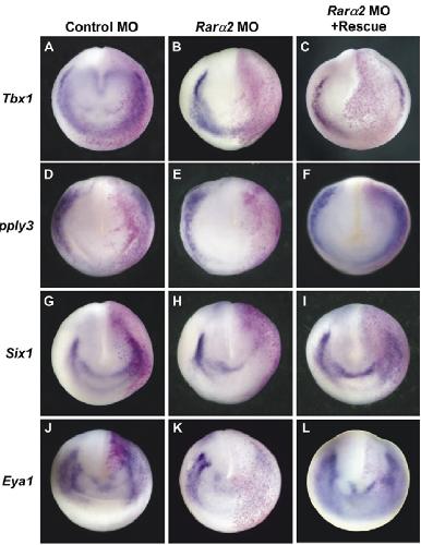 Fig. 4. RARalpha2 is required for expression of PPE genes. Embryos were injected unilaterally at the two- or four-cell stage. The injected side is on the right, as indicated by the magenta beta-galactosidase lineage tracer staining. (A,D,G,J) Control expression of Tbx1, Ripply3, Six1 and Eya1. (B,E,H,K) 10 ng RARalpha2 MO reduced expression of Tbx1 (14/15 embryos), Ripply3 (9/10), Six1 (6/11) and Eya1 (8/9). (C,F,I,L) 10 ng RARalpha2 MO + 0.5 ng RARalpha2 mRNA rescued expression of Tbx1 (5/11 embryos), Ripply3 (8/11), Six1 (11/14) and Eya1 (13/17). |