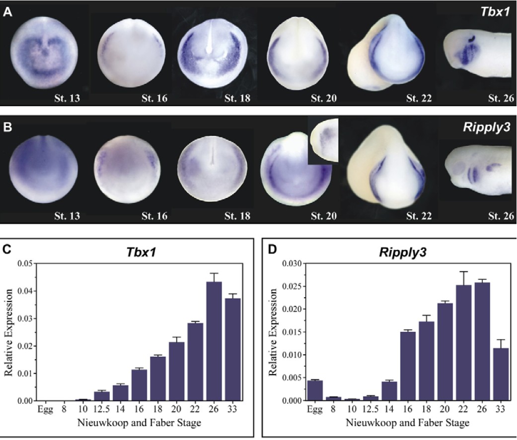 Fig. 1. Expression of Tbx1 and Ripply3 across developmental time. (A,B)ï Whole-mount in situ hybridization of Tbx1 (A) and Ripply3 (B) gene expression at Nieuwkoop and Faber developmental stages 13, 16, 18, 20, 22 and 26 (B). (C)ï QPCR showing Tbx1 gene expression over developmental time. (D)ï QPCR showing Ripply3 gene expression over developmental time. In C and D, the y-axis represents 2#61508;Ct values normalized to the housekeeping gene histone H4. |