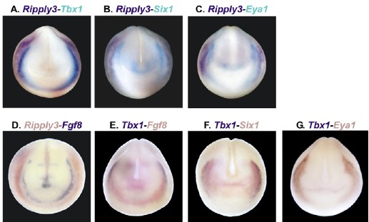 Fig. 5. Double whole-mount in situ hybridization reveals spatial relationship of PPE genes at stage 18. (A-C)Ripply3 (stained with BM Purple) is lateral to Tbx1, Six1 and Eya1 (stained with BCIP/Tetrazolium Blue), overlapping with Tbx1 and the posterior placodal (pp) area of Eya1. (D)Ripply3 (stained with Fast Red) is lateral to but does not overlap with Fgf8 (stained with BM-Purple). (E-G)Tbx1 (stained with BM Purple) is lateral to Fgf8, Six1 and Eya1 (all stained with Fast Red) in stage 18 embryos, overlapping significantly with Fgf8, and in the posterior placodal (pp) area of Eya1. |