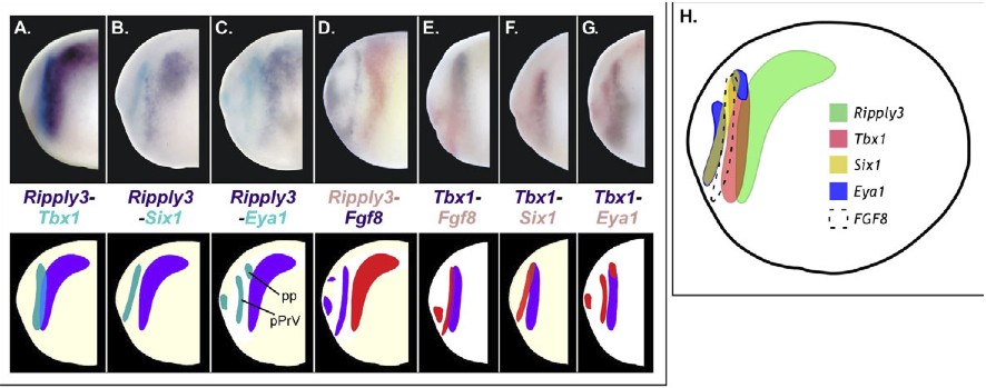 Genes referenced: eya1 fgf8 frzb2 psmd6 rab40b ripply3 six1 sox9 tbx1