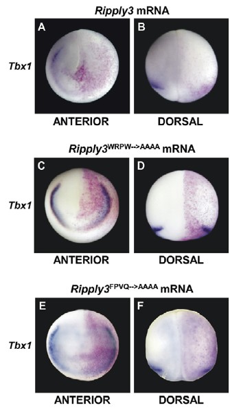 Fig. 10. Ripply3 gain of function causes loss of Tbx1 expression. Embryos were injected at the two- or four-cell stage and the injected side is on the right. (A,B)Anterior (A) and dorsal (B) views of embryos injected with 0.25 ng Ripply3 mRNA showing a knockdown of Tbx1 (11/11). (C,D)Anterior (C) and dorsal (D) views of embryos injected with 0.25 ng Ripply3WRPWrAAAA mRNA showing no change in Tbx1 (15/16) expression. (E,F)Anterior (E) and dorsal (F) views of embryos injected with 0.25 ng Ripply3FPVQrAAAA mRNA showing no change in Tbx1 expression (10/11). |