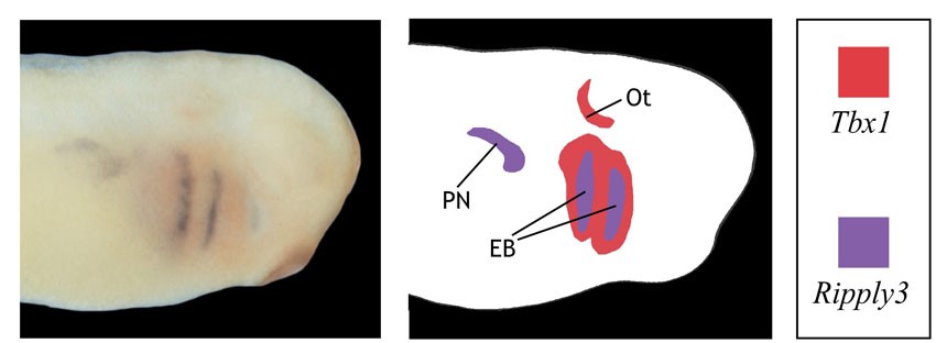 Fig. S2. Double WISH reveals spatial relationship of Tbx1 and Ripply3 expression at tailbud stage. (Left) Ripply3 (stained with BM Purple) and Tbx1 (stained with Fast Red) show overlapping expression in the epibranchial placodes (EB). Ripply3 is also expressed in the pronephros (PN), and Tbx1 in the otic placode (Ot). (Right) Schematic of expression patterns observed. |