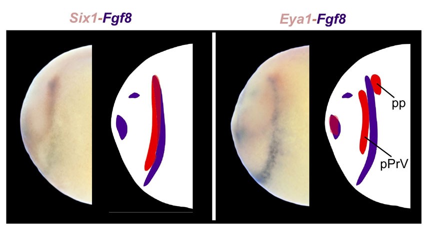 Fig. S4. Double WISH reveals spatial relationship of Fgf8 and Eya1 or Six1 at stage 18. Fgf8 (stained with BM Purple) overlaps with Six1 except at the bottom of the crescent. Fgf8 is expressed largely between the posterior placodal (pp) area and the profundal placode (pPrV) of Eya1, although some overlap is observed. |
