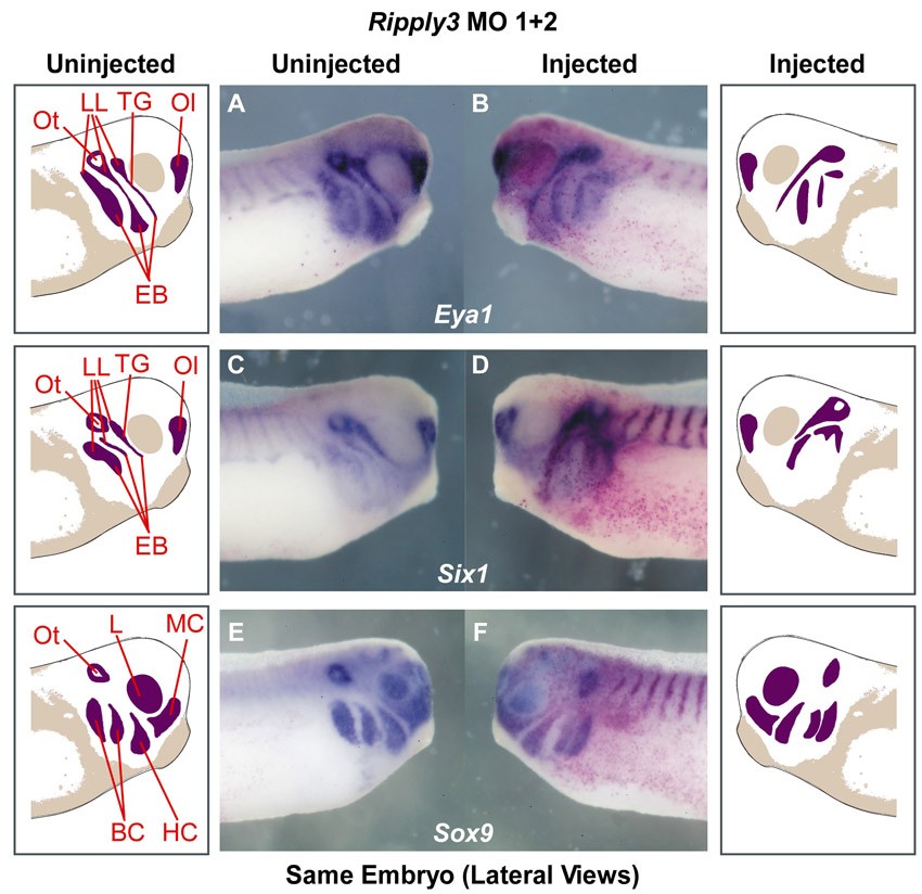 Fig. S10. Knockdown of Ripply3 disrupts placode morphology in the tailbud stage. All embryos were unilaterally injected at the two- or four- cell stage with 50 ng Ripply3 MO 1+2. Lateral views of the same embryo are shown facing each other. (A,C,E) Uninjected side showing control expression of Eya1, Six1 and Sox9. (B,D,F) Injected side showing altered placode morphology in Eya1 and Six1 in the spacing of the epibranchial placodes (EB), blurring of the lateral line placodes (LL), otic placode (Ot) and trigeminal placode (TG). The spacing of the hyoid crest (HC) and branchial crest (BC) is also altered in Sox9 expression. MC, mandibular crest; L, lens. |