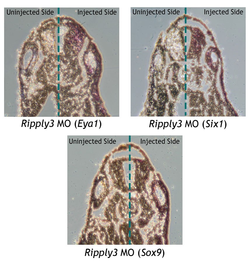 Fig. S11. Ripply3 MO embryos still form an otocyst. All embryos were unilaterally injected at the two- or four-cell stage with 50 ng Ripply3 MO 1+2. Paraffin-embedded tailbud stage embryos stained for Eya1, Six1 and Sox9 showing apparently solid otocyst morphology were sectioned transversely, 10 thick. Photographs (from different levels of the same embryo) are spliced from different sections (indicated by dotted line), to allow a direct comparison of otocyst morphology from the same embryo. |