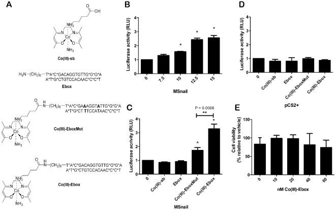 Figure 1. Co(III)-Ebox alleviates murine Snai1-mediated E-cadherin promoter repression.(A) Chemical structures; Co(III) Schiff base complex, Co(III)-sb; Ebox duplex oligonucleotide, Ebox; Co(III)-DNA conjugate with 2-base pair substitution in the Ebox region; Co(III)-EboxMut; Co(III)-DNA conjugate targeted to Snail factors, Co(III)-Ebox. (B) E-cadherin reporter gene activity in MCF7 cells expressing MSnail treated with Co(III)-Ebox from 0 to 15 nM. Data are represented as means ± s.e.m., n = 4. T-tests determined statistical significance from controls of 10 nM (P = 0.0034), 12.5 nM (P = 0.0060) and 15 nM (P = 0.0109) (*). (C) E-cadherin reporter gene activity in MCF7 cells expressing MSnail treated with 15 nM Co(III)-sb, Ebox, Co(III)-EboxMut or Co(III)-Ebox. Data are represented as means ± s.e.m., n = 4. T-tests determined statistical significance from controls of Co(III)-EboxMut (P = 0.0214) and Co(III)-Ebox (P = 0.0035) (*). Co(III)-Ebox to be significantly different from Co(III)-EboxMut (P = 0.0008) (**). (D) E-cadherin reporter gene activity in MCF7 cells transfected with pCS2+ (vector) treated with 15 nM Co(III)-sb, Ebox, Co(III)-EboxMut or Co(III)-Ebox. Data are represented as means ± s.e.m., n = 4. T-tests determined no statistical significance between the means. (E) MCF7 cell viability after treatment with Co(III)-Ebox at indicated concentrations after 24 h. Data are represented as means ± s.e.m., n = 3. T-tests determined no statistical significance between the means. |