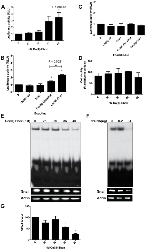 Figure 2. Co(III)-Ebox binds target proteins to alleviate transcriptional repression in metastatic MDA-MB-231 cells.(A) E-cadherin reporter gene activity in MDA-MB-231 cells treated with Co(III)-Ebox from 0 to 40 nM. Data are represented as means ± s.e.m., n = 4. T-tests determined statistical significance from controls of 40 nM (P = 0.0489) (*). (B) E-cadherin reporter gene activity in MDA-MB-231 cells treated with 35 nM Co(III)-sb, Ebox, Co(III)-EboxMut or Co(III)-Ebox. Data are represented as means ± s.e.m., n = 4. T-tests determined statistical significance from controls of Co(III)-EboxMut (P = 0.0290) and Co(III)-Ebox (P = 0.0001) (*). Co(III)-Ebox to be significantly different from Co(III)-EboxMut (P = 0.0008) (**). (C) Luciferase reporter gene activity in MDA-MB-231 cells with EcadMut-luc reporter treated with 35 nM Co(III)-sb, Ebox, Co(III)-EboxMut or Co(III)-Ebox. Data are represented as means ± s.e.m., n = 4. T-tests determined no statistical significance between the means. (D) MDA-MB-231 cell viability after treatment with Co(III)-Ebox at indicated concentrations after 24 h. Data are represented as means ± s.e.m., n = 3. T-tests determined no statistical significance between the means. (E) Inhibition of Snail DNA binding in MDA-MB-231 cells after 24 h with 0 to 40 nM Co(III)-Ebox. A representative EMSA of triplicate samples is shown with Western blots of Snai1 and Actin. (F) A representative EMSA of MDA-MB-231 cells treated with shRNA targeting Snai1 with Western blots of Snai1 and Actin. (G) Quantification of the percentage of Slug probe bound to Snai1 in (E) by using a STORM 680 phosphoimager. Data are represented as the means ± s.e.m., n = 3. |