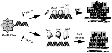Snail family proteins are core EMT (epithelial-mesenchymal transition) regulatory factors that play essential roles in both development and disease processes and have been associated with metastasis in carcinomas. Snail factors are required for the formation of neural crest stem cells in most vertebrate embryos, as well as for the migratory invasive behavior of these cells. Snail factors have recently been linked to the formation of cancer stem cells, and expression of Snail proteins may be associated with tumor recurrence and resistance to chemotherapy and radiotherapy. We report that Co(III)-Ebox is a potent inhibitor of Snail-mediated transcriptional repression in breast cancer cells and in the neural crest of Xenopus. We further show that the activity of Co(III)-Ebox can be modulated by temperature, increasing the utility of this conjugate as a Snail inhibitor in model organisms. We exploit this feature to further delineate the requirements for Snail function during neural crest development, showing that in addition to the roles that Snail factors play in neural crest precursor formation and neural crest EMT/migration, inhibition of Snail function after the onset of neural crest migration leads to a loss of neural crest derived melanocytes. Co(III)-Ebox-mediated inhibition therefore provides a powerful tool for analysing the function of these core EMT factors with unparalleled temporal resolution. Moreover, the potency of Co(III)-Ebox as a Snail inhibitor in breast cancer cells suggests its potential as a therapeutic inhibitor of tumor progression and metastasis.