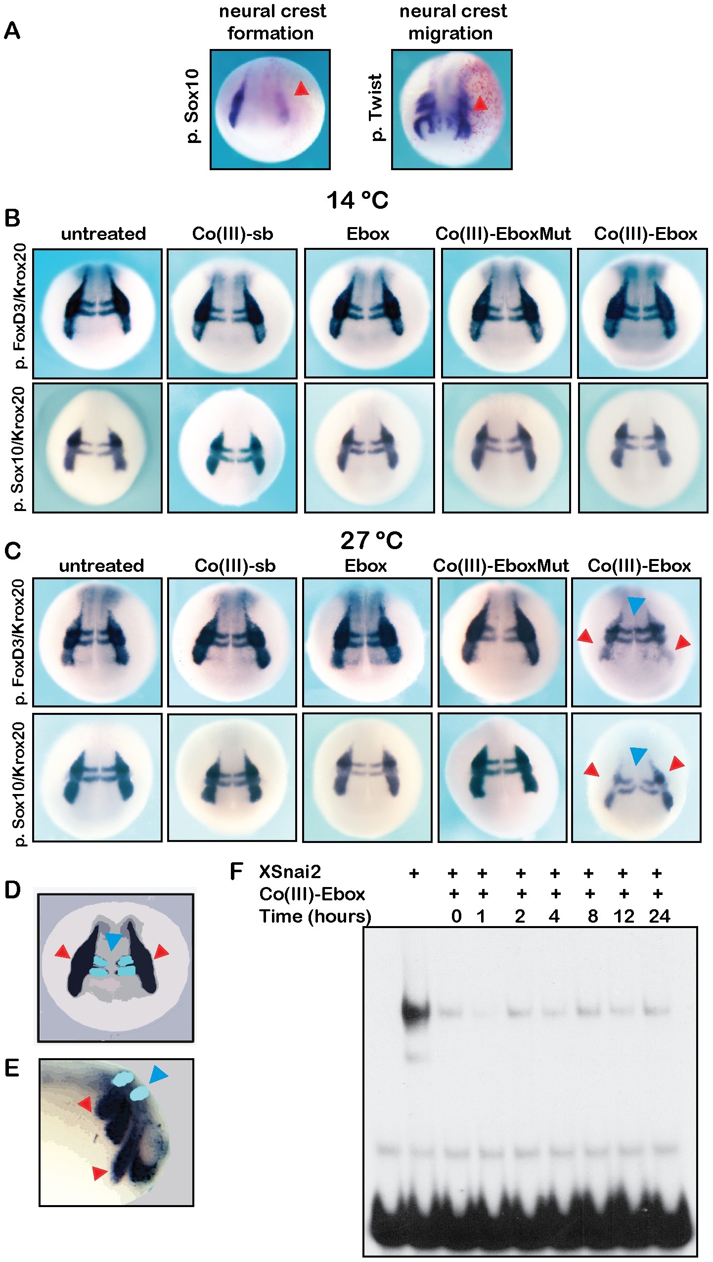 Figure 3. Co(III)-Ebox inhibits Snail-mediated neural crest cell specification in Xenopus via a temperature-dependent mechanism. (A) In situ hybridization of Sox10 expression showing neural crest formation (left) and Twist expression showing neural crest migration (right) of embryos injected with Co(III)-Ebox into one cells of embryos at the 8-cell stage. Embryos were co-injected with β-galactosidase mRNA as a lineage tracer (red staining). Neural crest forming/migrating regions indicated with arrowheads on the injected side. (B, C) In situ hybridization showing the neural crest of control embryos or embryos injected with Co(III)-sb, Ebox, Co(III)-EboxMut or Co(III)-Ebox and grown at 14 (B) or 27 (C). Top panel: whole mount in situ hybridization showing FoxD3 expression in the neural crest and Krox20 expression in rhombomeres 3/5 of the CNS. For FoxD3 embryos reared at 14, Co(III)-sb n = 12; Ebox n = 16; Co(III)-EboxMut n = 16; and Co(III)-Ebox n = 13. For FoxD3 embryos reared at 27, Co(III)-sb = 13; Ebox n = 18; Co(III)-EboxMut n = 14; and Co(III)-Ebox n = 18. Bottom panel: expression of Sox10 in the neural crest and Krox20 (blue arrowheads). For Sox10 embryos reared at 14, Co(III)-sb n = 21; Ebox n = 33; Co(III)-EboxMut n = 35; and Co(III)-Ebox n = 38. For Sox10 embryos reared at 27, Co(III)-sb = 33; Ebox n = 35; Co(III)-EboxMut n = 35; and Co(III)-Ebox n = 36. Loss of Sox10 and FoxD3 is seen in the neural crest forming regions of embryos treated with Co(III)-Ebox grown at 27 (red arrowheads). (D) Cartoon representation of expected in situ hybridization result for Krox20 and neural crest markers (Sox10 and FoxD3) at stage 17. Black staining represents neural crest forming regions visualized by in situ hybridization for Sox10 or FoxD3 and indicated by red arrows. Pale blue staining indicates hindbrain forming regions of rhombomeres 3 and 5 visualized by in situ hybridization with Krox20 and indicated by blue arrows. (E) Cartoon representation of expected in situ hybridization result for Krox20 and neural crest markers (Sox10 and Twist) during neural crest cell migration. Black staining represents migrating neural crest regions visualized by in situ hybridization for Sox10 or Twist and indicated by red arrows. Pale blue staining indicates hindbrain forming regions of rhombomeres 3 and 5 visualized by in situ hybridization with Krox20 and indicated by blue arrows. (F) Co(III)-Ebox incubated in embryo lysate for 0 to 24 hours retains the and ability to inhibit XSnai2 DNA binding as visualized by EMSA. |