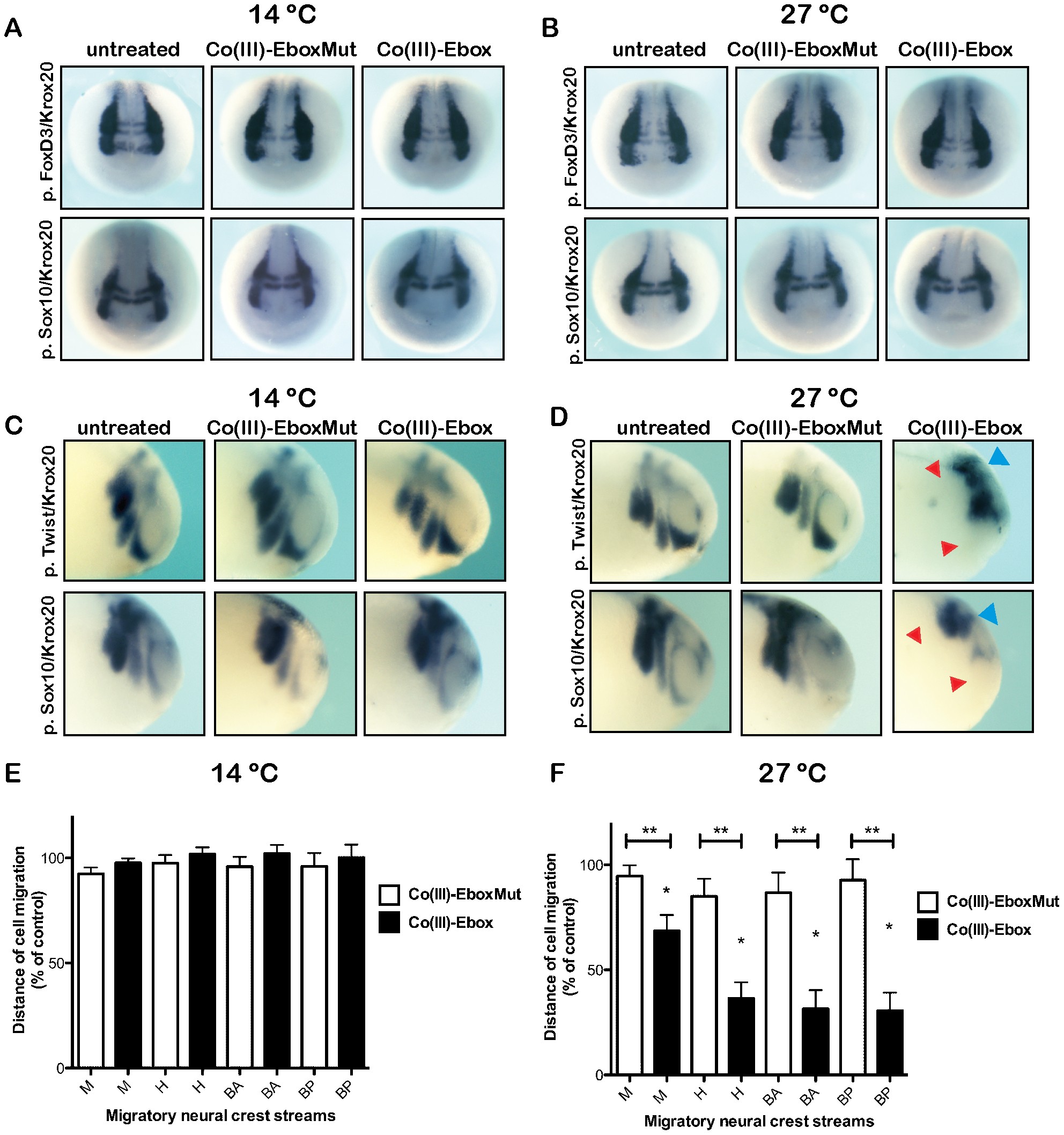 Figure 4. Co(III)-Ebox impairs neural crest cell migration in Xenopus embryos independently of neural crest specification. (A) In situ hybridization showing neural crest of embryos injected with Co(III)-Ebox or Co(III)-EboxMut during neurulation stages maintained at 14 (A, C) or 27 (B, D). (A, B) Co(III)-Ebox does not affect pre-migratory neural crest at 14 (A) or 27 (B) seen by in situ hybridization for FoxD3 (top panel) or Sox10 (bottom panel) For FoxD3 embryos maintained at 14, untreated n = 14; Co(III)-EboxMut n = 15; and Co(III)-Ebox n = 15. For embryos maintained at 27, untreated = 15; Co(III)-EboxMut n = 15; and Co(III)-Ebox n = 15. For Sox10 embryos maintained at 14, untreated n = 12; Co(III)-EboxMut n = 15; and Co(III)-Ebox n = 15. For embryos maintained at 27, untreated = 15; Co(III)-EboxMut n = 15; and Co(III)-Ebox n = 15. Krox20 is used to visualize non neural crest tissue in the hindbrain. (C) Embryos treated with Co(III)-Ebox have normal neural crest migration at 14. (D) Embryos treated with Co(III)-Ebox grown at 27 show impaired neural crest migration (red arrowheads) visualized by in situ hybridization for Twist and Krox20 (top panel) or Sox10 and Krox20 (bottom panel). For Twist embryos maintained at 14, untreated n = 14; Co(III)-EboxMut n = 14; and Co(III)-Ebox n = 14. For embryos maintained at 27, untreated n = 11; Co(III)-EboxMut n = 10; and Co(III)-Ebox n = 17. For Sox10 embryos maintained at 14, untreated n = 14; Co(III)-EboxMut n = 11; and Co(III)-Ebox n = 12. For embryos maintained at 27, untreated n = 13; Co(III)-EboxMut n = 12; and Co(III)-Ebox n = 14. (E, F) Quantification of normalized neural crest migration from Twist expression represented as means s.e.m. M = mandibular, H = hyoid, BA = anterior branchial, BP = posterior branchial. (E) T-tests determined no significant difference between embryos at 14. (F) T-tests determined that neural crest streams of embryos treated with Co(III)-Ebox are significantly different from controls [single star (*), M, P = 0.0002; H, P<0.0001; BA, P<0.0001 and BP, P<0.0001] and from embryos treated with Co(III)-EboxMut [double stars (**)] M, P = 0.0245; H, P = 0.0004, BA, P = 0.0005; and BP, P = 0.0001] at 27. |