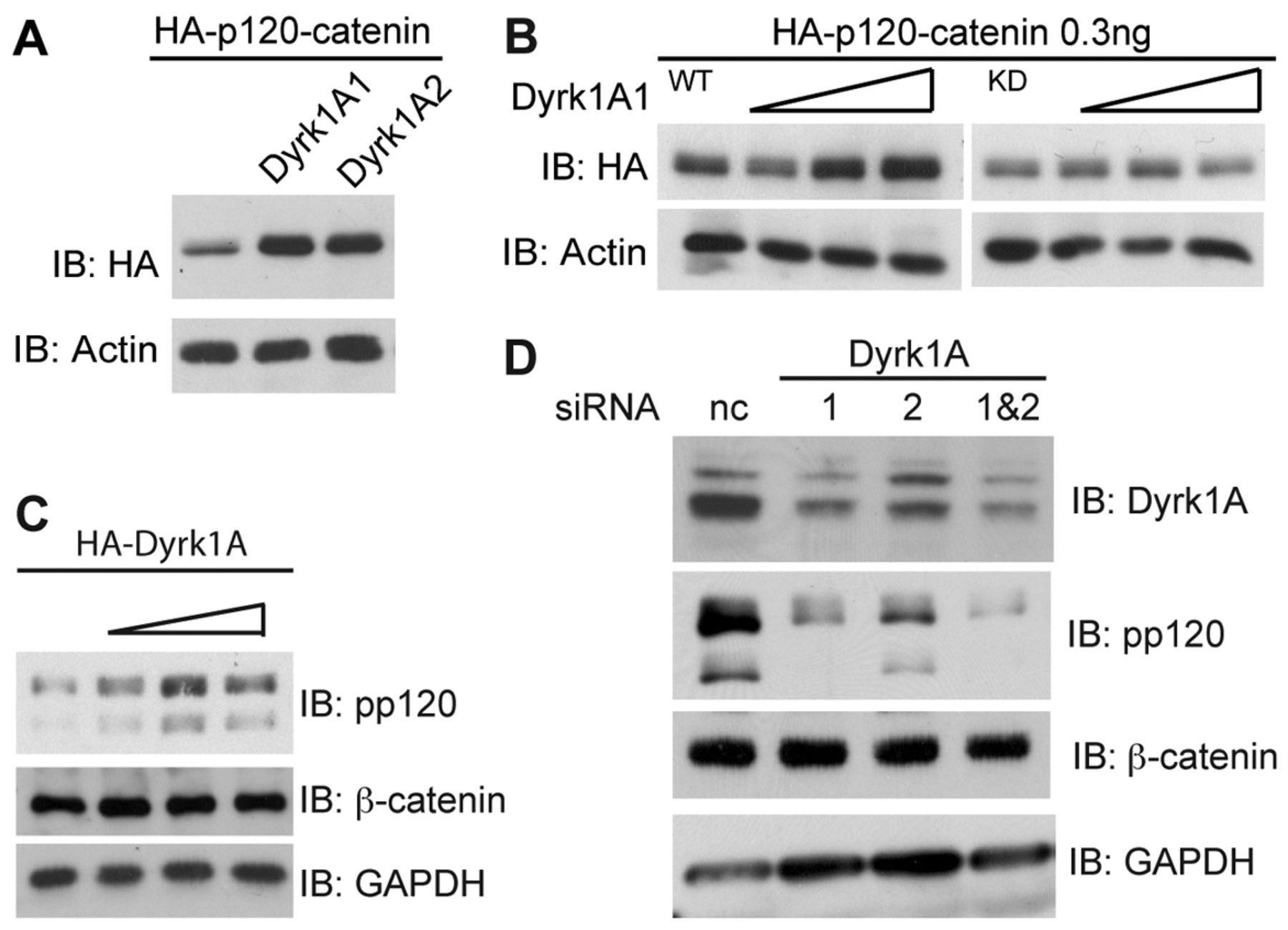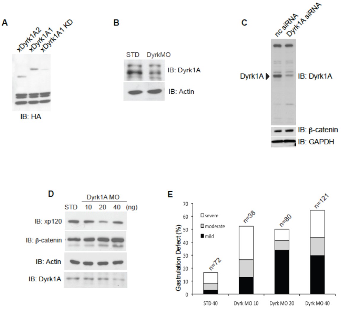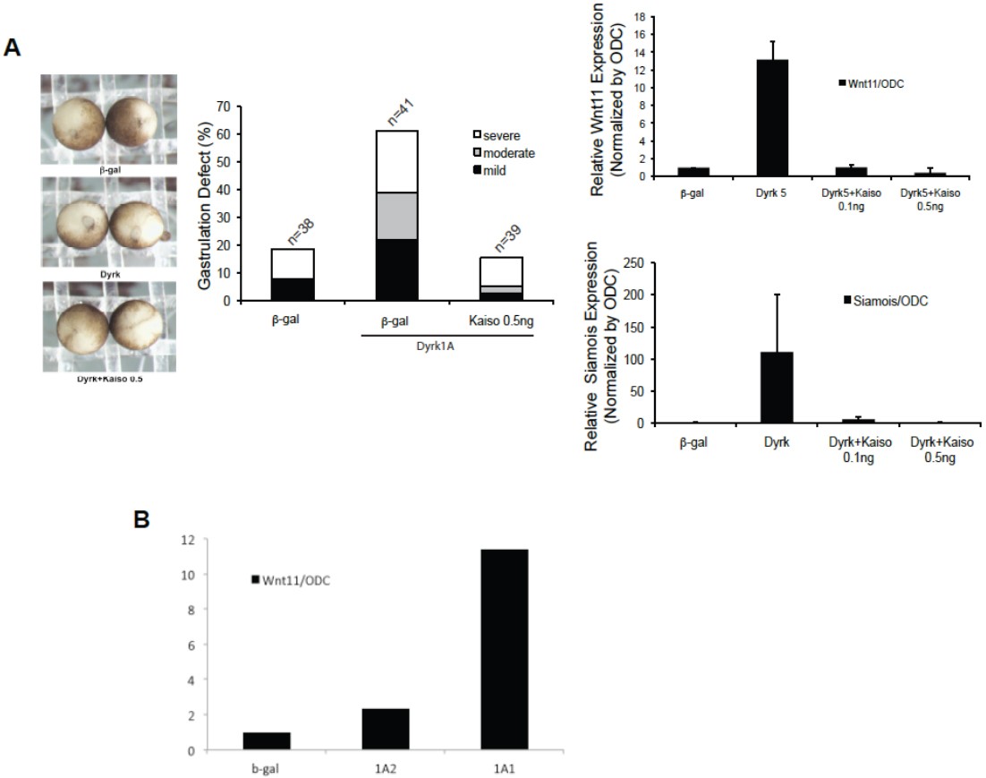 The Wnt pathways contribute to many processes in cancer and development, with β-catenin being a key canonical component. p120-catenin, which is structurally similar to β-catenin, regulates the expression of certain Wnt target genes, relieving repression conferred by the POZ- and zinc-finger-domain-containing transcription factor Kaiso. We have identified the kinase Dyrk1A as a component of the p120-catenin-Kaiso trajectory of the Wnt pathway. Using rescue and other approaches in Xenopus laevis embryos and mammalian cells, we found that Dyrk1A positively and selectively modulates p120-catenin protein levels, thus having an impact on p120-catenin and Kaiso (and canonical Wnt) gene targets such as siamois and wnt11. The Dyrk1A gene resides within the Down's syndrome critical region, which is amplified in Down's syndrome. A consensus Dyrk phosphorylation site in p120-catenin was identified, with a mutant mimicking phosphorylation exhibiting the predicted enhanced capacity to promote endogenous Wnt-11 and Siamois expression, and gastrulation defects. In summary, we report the biochemical and functional relationship of Dyrk1A with the p120-catenin-Kaiso signaling trajectory, with a linkage to canonical Wnt target genes. Conceivably, this work might also prove relevant to understanding the contribution of Dyrk1A dosage imbalance in Down's syndrome.