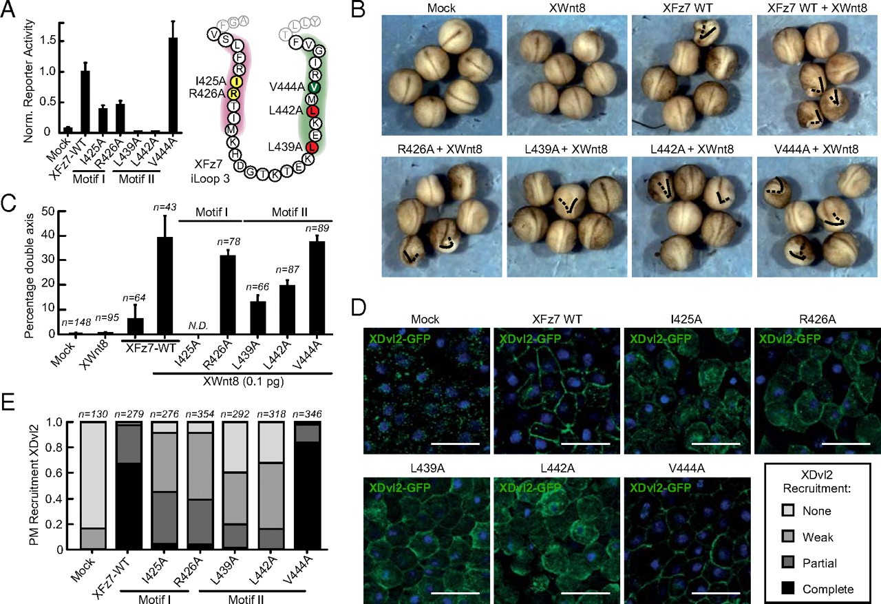 Fig. 3. XFz7 motifs I and II are essential for Wnt-mediated signaling and XDvl2 recruitment in Xenopus embryos. (A) XFz7 iLoop3 motif I and II mutants display decreased Wnt3a-induced signaling. Indicated motif I and II XFz7 mutants were tested in the TOPFlash luciferase reporter assay as in Fig. 2A. (Left) Shown are the average normalized values of three individual experiments; error bars indicate SDs. Mock, empty vector. (Right) Color-coded activity map of tested XFz7 iLoop3 residues (as in Fig. 2C). (B) XFz7 motif II mutants are defective in secondary axis formation in Xenopus embryos. Ventral injections of combined mRNAs encoding for XFz7 variants and XWnt8 were used to compare β-cateninâmediated secondary axis formation. The primary axis is indicated by straight lines, and (partial) secondary axes are indicated by dotted lines. (C) Quantification of the results presented in B. XFz7 I425A caused severe embryonic lethality and was not quantified. Shown are the average percentages of axis duplication of three independent experiments; error bars depict SEs. The number of counted embryos per condition is indicated. (D) Colocalization of XFz7 motif I and II mutants and XDvl2-GFP in Xenopus animal cap explants is impaired. (Scale bars: 100 μm.) (E) Quantification of the results in D (as in Fig. 2 D and E). The number of counted cells is indicated.