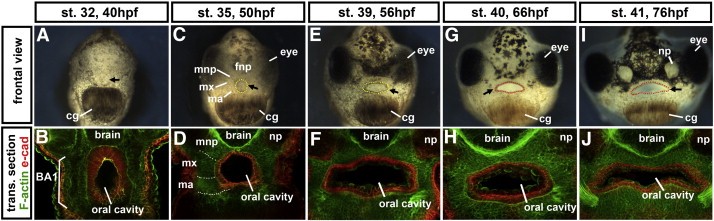 Fig. 1. Facial development in Xenopus laevis from stages 32â41 (40â76 hpf). A, C, E, G, I) Frontal views of tadpole faces. The arrow points to the stomodeum (outlined in yellow dots) or embryonic mouth (outlined in red dots). B, D, F, H, J) Transverse sections through the facial prominences. E-cadherin labels epithelium (red), and all tissue is counterstained with phalloidin (which labels F-actin, green). Abbreviations: BA1; 1st branchial arch, cg; cement gland, mx; maxillary prominence, mnp; medial nasal prominence, ma; mandibular prominence, np; nasal placode or pit. |