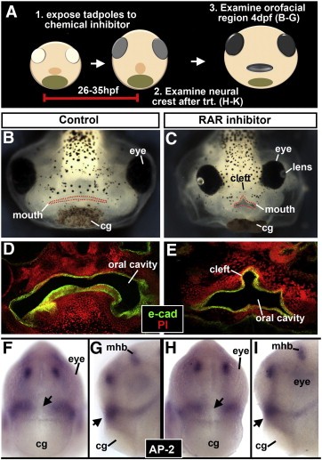 Fig. 4. A) Schematic showing experimental plan for BâI. B,C) Frontal view of tadpoles at 4 dpf showing the shape of the embryonic mouth (dotted in red). D,E) Transverse sections of the orofacial region. E-cadherin labels the epithelium (green), counterstained with propidium iodide (red). FâG) In situ hybridizations for the neural crest marker AP-2 (blue). F,H) Frontal views. G,I) Lateral views. The arrow points to the stomodeum or oral cavity. Abbreviations: cg; cement. PI; propidium iodide, e-cad; e-cadherin, mhb; midbrainâhindbrain boundary. |