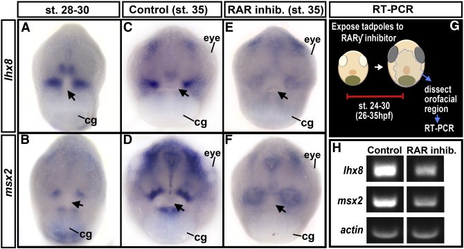 Fig. 5. AâF) Frontal views of whole mount in situ hybridizations for lhx8 and msx2, (mRNA in blue). The arrow points to the stomodeum. G) Schematic showing the experimental plan H. H) RT-PCR using lhx8, msx2 and actin specific primers for control and RAR inhibitor treated tadpoles. Abbreviations: cg; cement gland. |