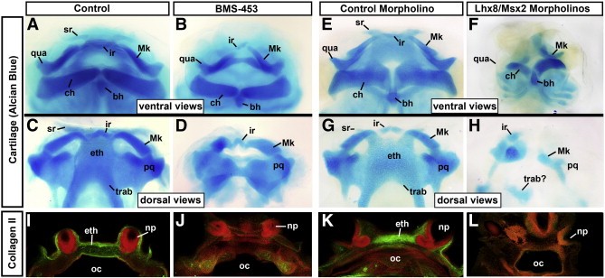 Fig. 8. AâH) Alcian blue staining showing cartilage in 4â5 dpf tadpoles. Top row shows the ventral views and the second row shows the dorsal views. IâN) Transverse sections at 3â4 dpf through the primary palate region. Collagen II immunohistochemistry (green) counterstained with propidium iodide (red). Abbreviations, sr; suprarostral, qua; quadrate, ir; infrarostral, Mk; Meckel's, ch; ceratohyal, bh; basihyal, eth; ethmoid, trab; trabecular, pq; palatoquadrate, np; nasal pit, oc; oral cavity. |