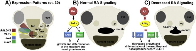 Fig. 9. Model of the experimental results. A) Frontal view of a representative embryo at stage 30 (35 hpf) showing expression domains of RALDH2, RARγ, lhx8 and msx2 overlaid onto the prospective facial prominences. B) A simple model of how retinoic acid and lhx8/msx2 regulate growth and differentiation of the prominences that contribute to the upper lip and primary palate. C) Decreased retinoic acid signaling results in decreased Lhx8 and Msx2 function. This in turn results in decreased growth and differentiation of the prominences that contribute to the upper lip and primary palate contributing to the formation of a median cleft. Abbreviations: mx; maxillary prominence, mnp; medial nasal prominence, ma; mandibular prominence, op; olfactory placode or pit. |