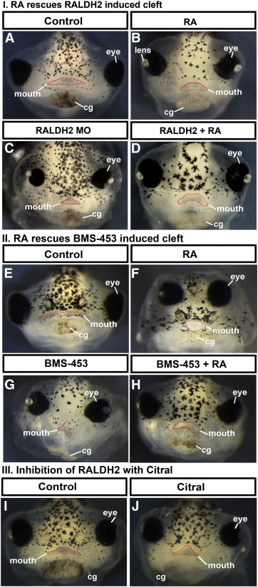 Supplemental Fig. 1. I. Retinoic acid reverses the RALDH2 morpholino induced cleft. A) Frontal views of embryos at stages 412. II. Retinoic acid reverses the RAR inhibitor (BMS-453) induced median dorsal cleft. E) Frontal views of embryos at stages 412. III. Citral treatment. I,J) Frontal views of embryos at stages 412. The mouth is outlined in red dots in all figures. |