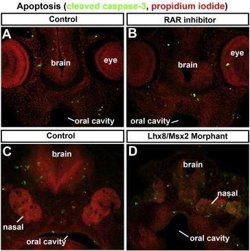 Supplemental Fig. 5. A) Transverse sections through the dorsal facial prominences at stages 370, showing cleaved caspase-3 immunohistochemistry (green) counterstained with propidium iodide (red) after either RAR inhibitor treatment (A,B) or lhx8/msx2 morpholino injections (C,D). |