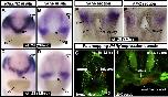Fig. 2. AâD) frontal views of tadpole faces showing whole mount in situ hybridizations of RALDH2 (A,C) and RARγ (B,D) mRNA expression. The cement gland (cg) is pseudo-colored brown. The arrow points to the stomodeum. E,F) Transverse sections of RARγ mRNA expression and neural crest marker AP-2 in the orofacial region. G,H) DiI (red) fate mapping and phalloidin counterstaining labeling all F-actin (green). G) A frontal view of a tadpole fixed immediately post labeling with DiI in the RARγ expression domain at stage 28 (corresponding to panel D). The arrow points to the stomodeum. H) DiI labeling in transverse section approximately 40 h post labeling. DiI is observed in the primary palate region dorsal to the oral cavity. Abbreviations: cg; cement gland. |