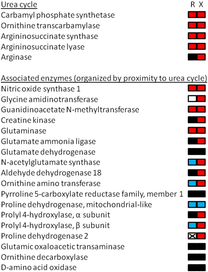 Figure 1. Cartoon depiction of RNA-seq results from the liver of premetamorphic Xenopus laevis and Rana catesbeiana tadpoles focusing upon arginine and proline metabolism including the urea cycle. Tadpoles were exposed to 10 nM 3,5,3′-triiodothyronine (a thyroid hormone) or NaOH vehicle control for 48 h. The animals were treated and maintained in accordance with the guidelines of the Canadian Council on Animal Care. The liver transcriptomes were subjected to RNA-seq using 75 base HiSeq of paired end tagged (PET) libraries. The derived sequence information was assembled using the X. tropicalis genome as a scaffold and the contig identities were determined by a Blastx search against the X. tropicalis genome. The number of read counts (~400 million) was normalized between samples and the relative count frequencies of the indicated pathway components were compared based upon the X. tropicalis arginine and proline metabolism KEGG pathway (xtr00330; www.genome.jp/kegg). The results are depicted as a bipartite rectangle beside the name of the enzymes corresponding with measured transcripts in the RNA-seq experiment that were identified in the KEGG pathway. The left side represents the relative change in transcript abundance levels of Rana (R) and the right side mRNA levels of Xenopus (X) where red is increased, black is no change, and blue is decreased relative to control animals. Non-detected transcript is depicted by a crossed-out white box. Use of the X. tropicalis genome as an assembly scaffold had limited utility since X. laevis and R. catesbeiana sequences aligned imperfectly to the X. tropicalis genome with R. catesbeiana, not surprisingly, having the least benefit of alignment. Nevertheless, some transcript identities linked to count frequencies were positively confirmed and the data obtained for the urea cycle enzymes, for example, matched well with previous observations (Helbing et al., 1992; Xu et al., 1993; Iwase et al., 1995). This validates the method for transcripts that are identifiable and quantifiable in this way.