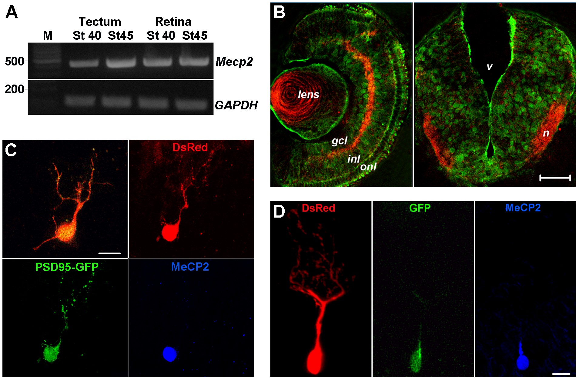 MeCP2 immunofluorescence (blue) after fixation. D) Tectal neuron transfected with DsRed2 and a wt-hMeCP2-IRES-GFP plasmid. Live confocal