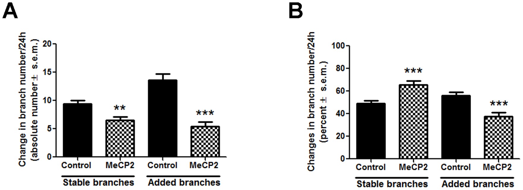 stability of existing branches. The absolute (A) and relative (B) number of stabilized and newly added branches in MeCP2 overexpressing