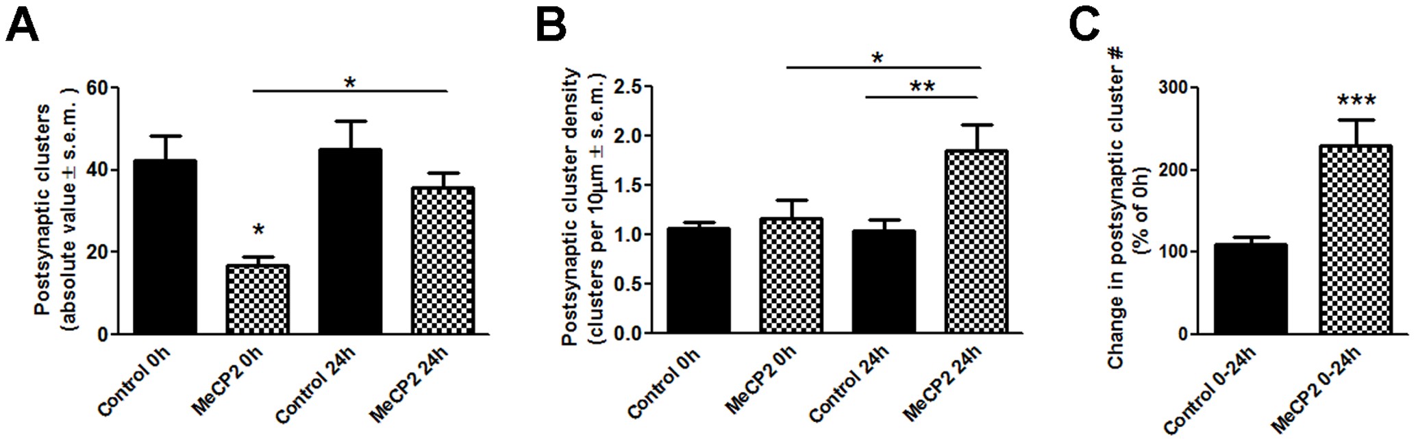 controls by 24 hours. (C) hMeCP2-expressing neurons increase their postsynaptic clusters number by approximately two-fold in 24 hours.