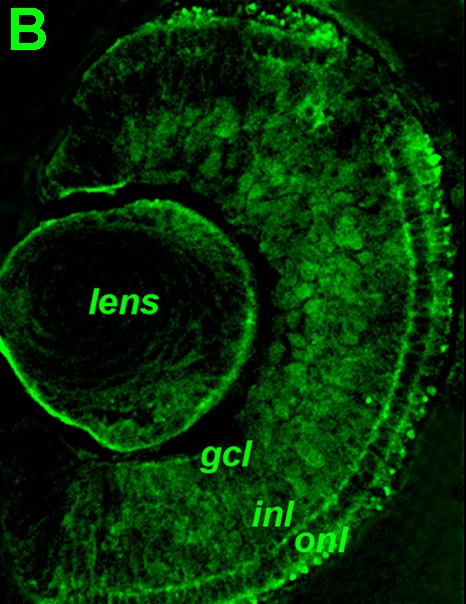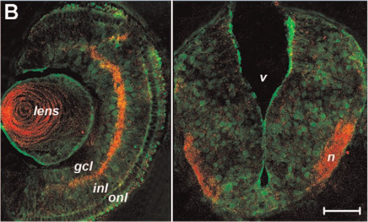 (green) are localized to the ganglion cell layer (gcl) and inner nuclear layer (inl) of the developing retina. The retinal synaptic layers are shown by the