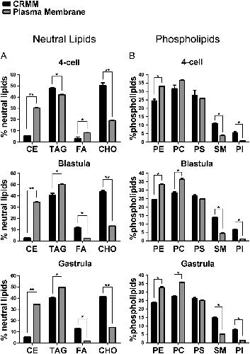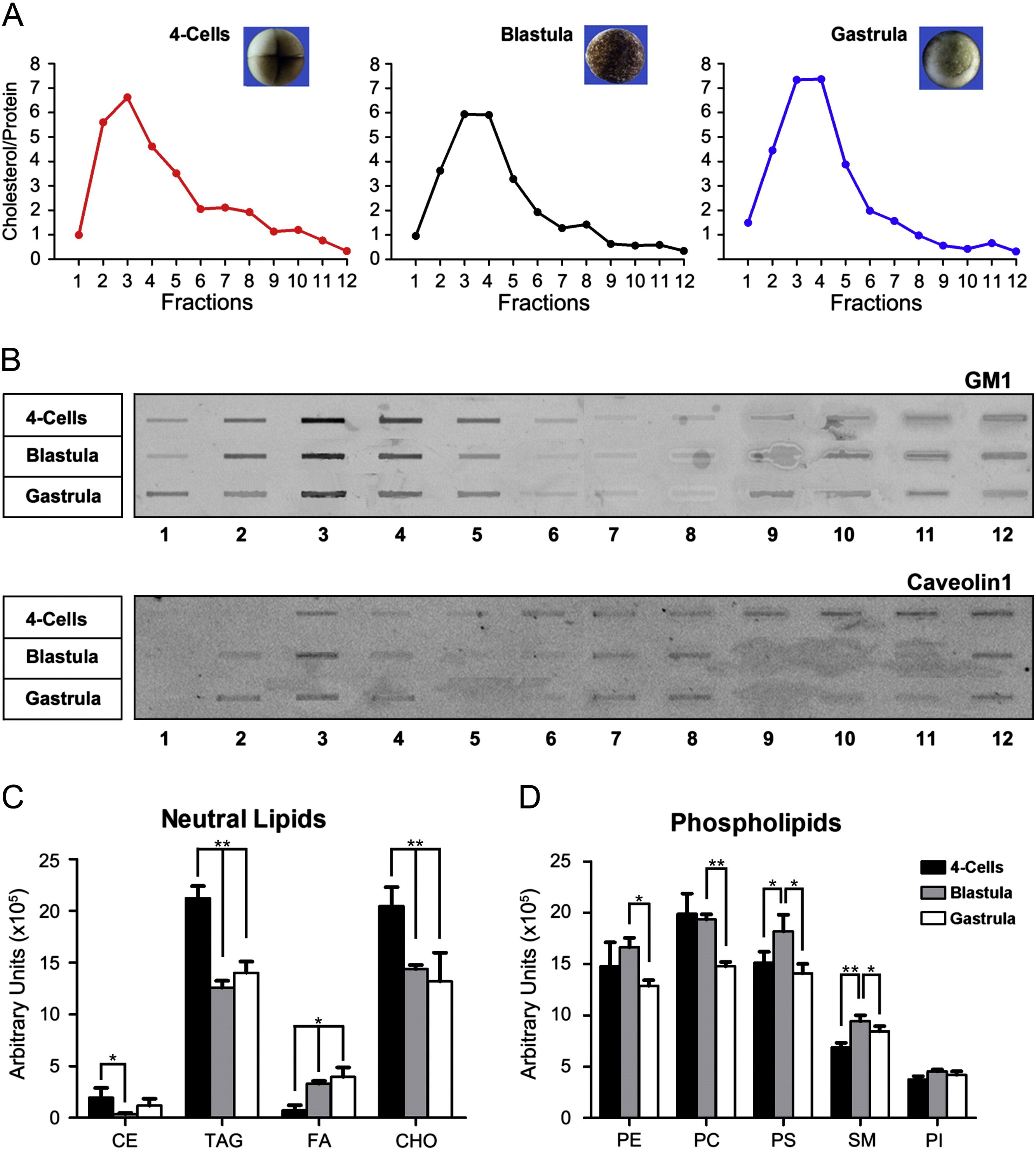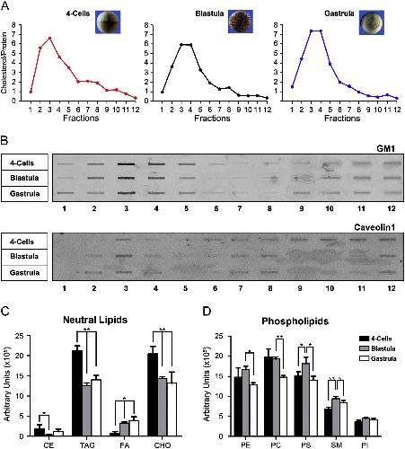 Fig. 1. CRMMs are present and have a dynamic composition during development. (A) Cholesterol content assays of the fraction obtained by the sucrose gradient showed a peak in low-density fractions at the 4-cell, blastula and gastrula stages. (B) Dot blot analysis revealed the presence of GM1 ganglioside and Caveolin1 protein in the low fractions. (C) Lipid characterization showed cholesterol (CHO) and triacylglycerol (TAG) as the most abundant among the neutral lipids, while phosphatidylethanolamine (PE), phosphatidylcholine (PC) and phosphatidylserine (PS) were the predominant phospholipids in the CRMM fraction. (CE) cholesterol ester, (FA) fatty acid, (SM) sphingomyelin, (PI) phosphatidylinositol. (*P < 0.05; **P < 0.01). |