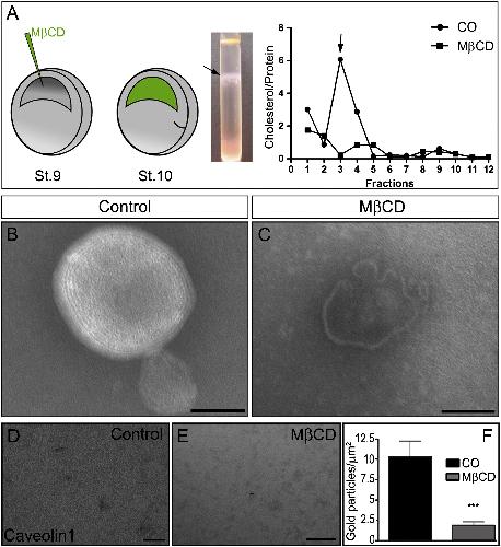 Fig. 2. MβCD disrupts Xenopus embryo CRMMs composition and morphology. (A) MβCD was injected into the blastocoel of stage 9 embryos and grown until stage 10. After centrifugation in sucrose gradient, CRMMs were observed as a turbid fraction in the light portion of the gradient (arrow). A peak of cholesterol content in light fractions characterizes the presence of CRMMs at the gastrula stage (arrow and circle lines). This peak is lost after MβCD injection, suggesting the disorganization of CRMMs (square lines represent the 40 mM MβCD cholesterol depletion). (B) The fraction with isolated CRMMs observed by negative staining, shows a multilamellar structure 73% (n = 15); while the fraction obtained from MβCD-treated embryos (C) shows a disorganized unilamellar vesicular structure 85% (n = 14). (D) Caveolin1 immunoassay of the CRMM fraction shows significantly decreased staining in the MβCD fraction compared to the control (CO) fraction. ***P < 0.001 by Mannhitney test. Scale bars: B, C, D: 0.1 μm; E: 0.2 μm. |