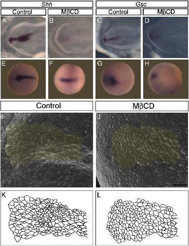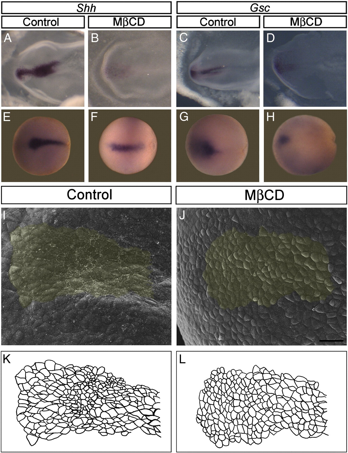 Fig. 6. The prechordal plate is defectively formed in MβCD-injected embryos. Chick embryo in situ hybridization for the PcP markers Shh (A and B) and Gsc (C and D) shows reduction of these PcP markers in MβCD-treated embryos. In Xenopus embryos, the anterior expression of Shh and Gsc is also reduced (E). Scanning Electron micrographs of the outer side of the neural plate of Xenopus embryos show polarized cells and a rosette-like arrangement in the control (I), while this morphology is lost by cholesterol depletion (J). Schematic drawing highlights the morphology of the anterior midline cells from control (K) and MβCD-injected embryos (L). Schematic drawing was artificially colored in photomicrographs I and J. Scale bar: 50 μm. |