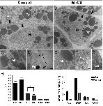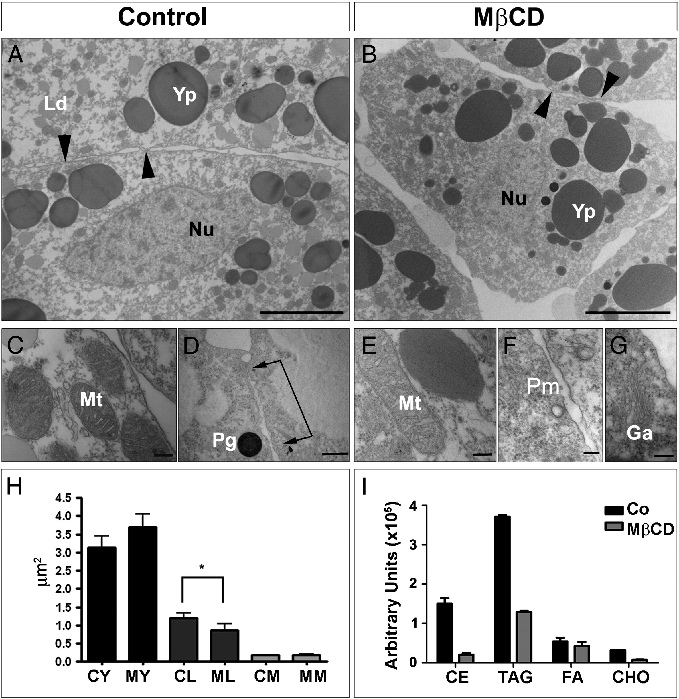 Fig. 3. MβCD-induced cholesterol depletion does not affect overall cell ultrastructure, but alters the lipid droplet vesicles. Representative transmission electron microscopy photomicrographs depicting cell ultrastructure from the equatorial dorsal side of control and MβCD-injected embryos. (A) In both control and MβCD-injected embryos, neighbor cells displayed a preserved plasma membrane (Pm), and contact between cells can be observed (arrows and arrowheads, A, B, D and F). Nuclei (Nu) are also evident, showing condensed chromatin. Several yolk platelets (Yp) of different sizes as well as lipid droplets (Ld) are typically found in both control and MβCD-injected embryos. Mitochondria (Mt, C and E), pigment granules (Pg, D) and Golgi apparatus (Ga, G) were also evident in control and MβCD-injected embryos. (H) Morphometric analyses revealed a decreased area in lipid droplets of MβCD-injected embryos, while yolk platelets and mitochondria were unaltered. Control yolk platelets (CY), MβCD yolk platelets (MY), control lipid droplets (CL), MβCD lipid droplets (ML), control mitochondria (CM), MβCD mitochondria (MM). (I) The composition of the lipid droplets was also altered, as seen by thin-layer chromatography of neutral lipids: cholesterol ester (CE), triacylglycerol (TAG), cholesterol (CHO) and fatty acids (FA) were decreased after MβCD injection. Scale bars: A: 6 μm, B: 5 μm, C, E, G: 0.2 μm, D: 0.6 μm, F: 0.1 μm. |