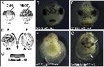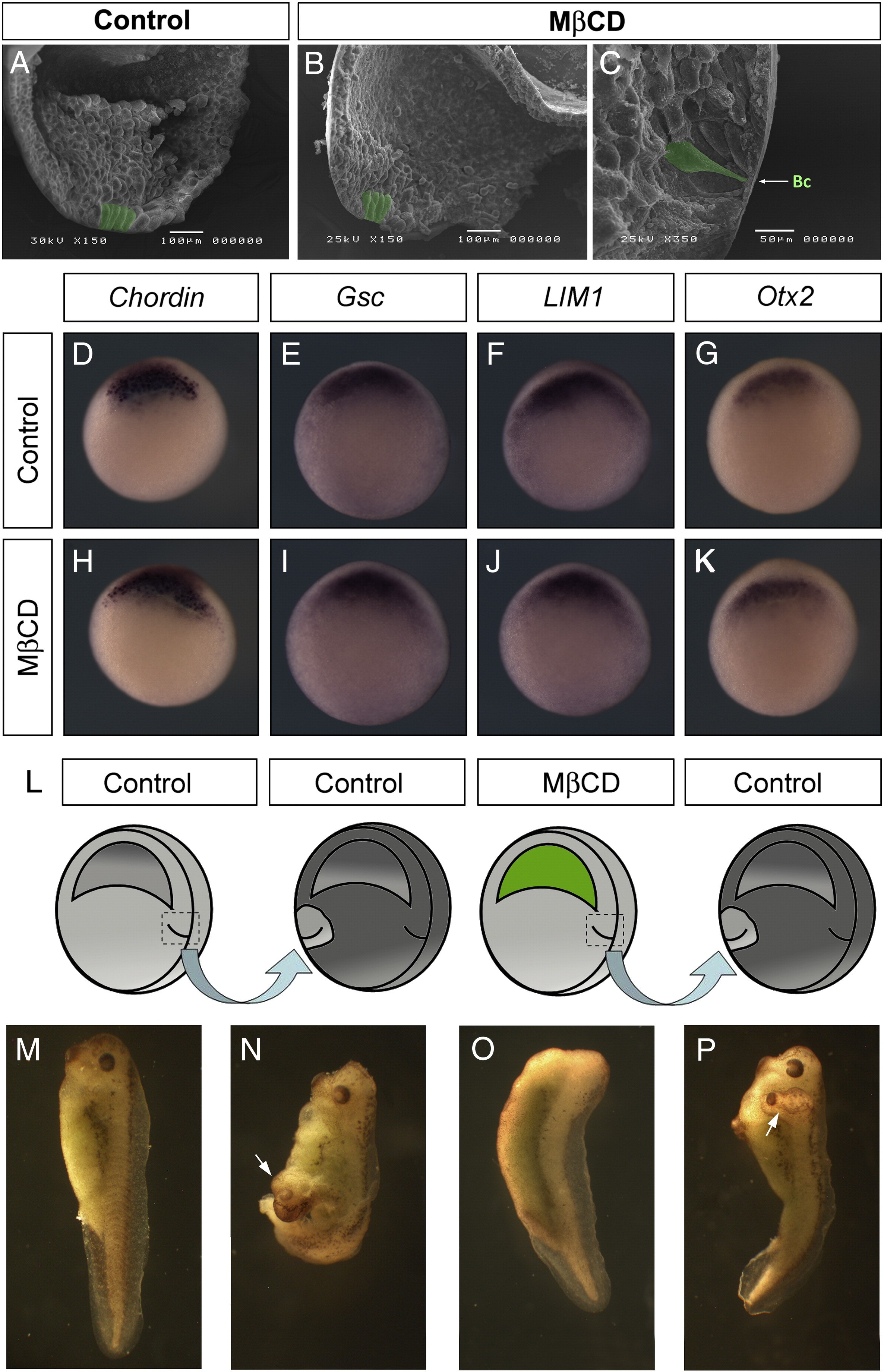 Fig. 5. Cholesterol depletion has no effect on the Spemann's organizer. Scanning electron microscopy shows the blastocoel roof and migrating post-mesodermal cells of the dorsal side. Bottle cells (Bc, light green) appear to be morphologically preserved in MCD-injected embryos (B) and control (A) embryos. In situ hybridization of chordin, goosecoid (Gsc), LIM1 and Otx2 in early gastrula Xenopus embryos (D). In both control (D) and MβCD-injected (H) embryos, the expression domains of these genes were not altered. Spemann's graft experiment where dorsal lips of uninjected and MβCD-injected gastrula embryos were grafted on the ventral side of uninjected gastrula embryos and developed until stage 35 (L). A control embryo develops normally (M). When the dorsal lip from a donor control embryo is grafted on the ventral side of a control embryo, a secondary axis containing the head is detected (N, arrow). MβCD-injected embryo showing loss of head structures (O). An MβCD-injected dorsal lip grafted on the ventral side of a control embryo is capable of inducing a secondary axis containing a head (P, arrow). |