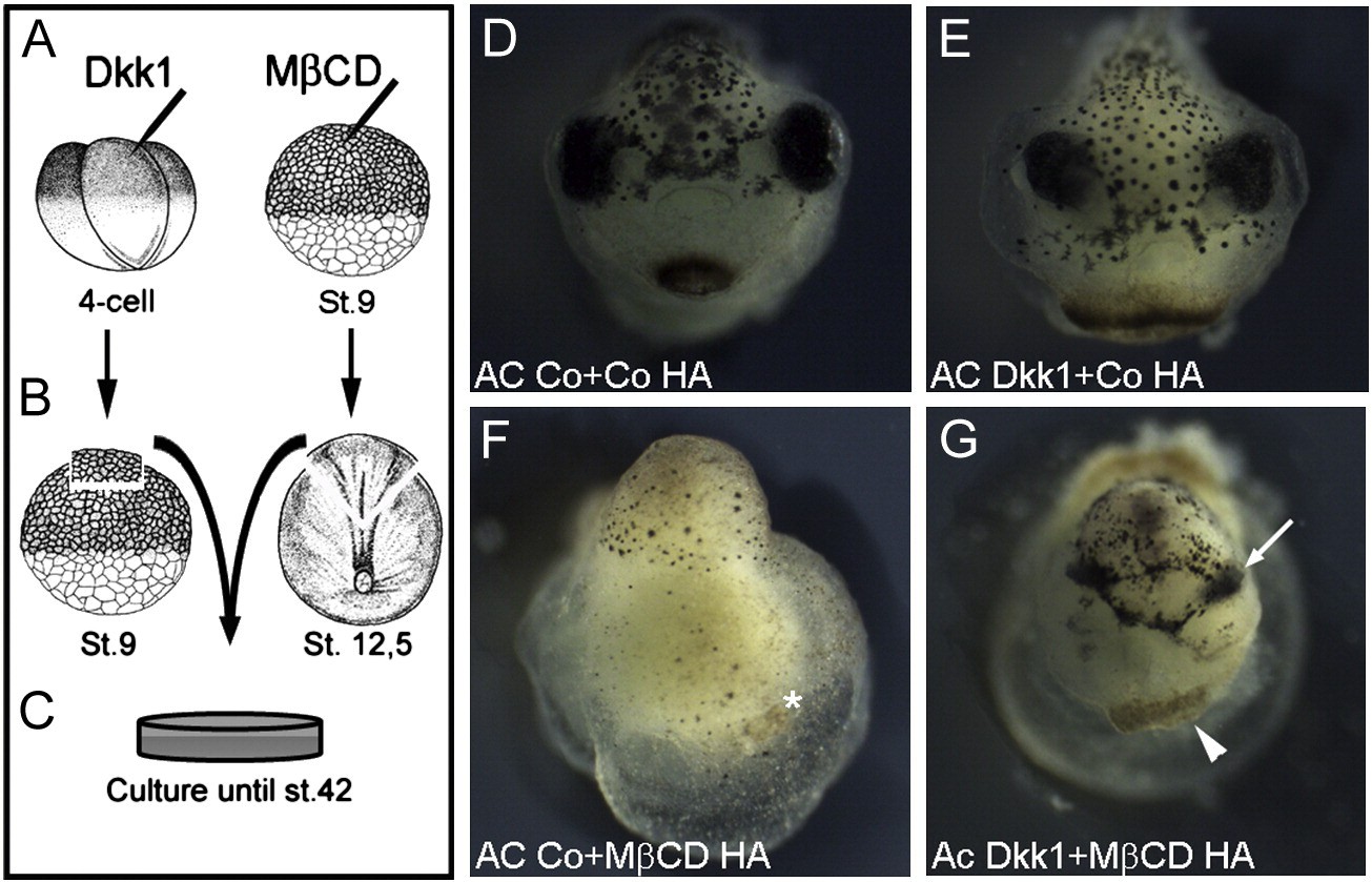 Fig. 7. Head anlage from MβCD-injected embryos is partially rescued by Dkk1. Schematic drawing showing animal caps (AC) of Dkk1 RNA injected embryos or control AC (A) were grafted to HA of control or MβCD-injected embryos (B). The explants were cultured until stage 42 (C). HA control with AC control generated normal heads (D). Dkk1 AC with control HA generated an anteriorized head (E). AC control with MβCD-HA generated a posteriorized head (F). Dkk1 AC with MβCD-HA generated head containing small symmetrical eyes (arrow) and cement gland (arrowhead, G). |