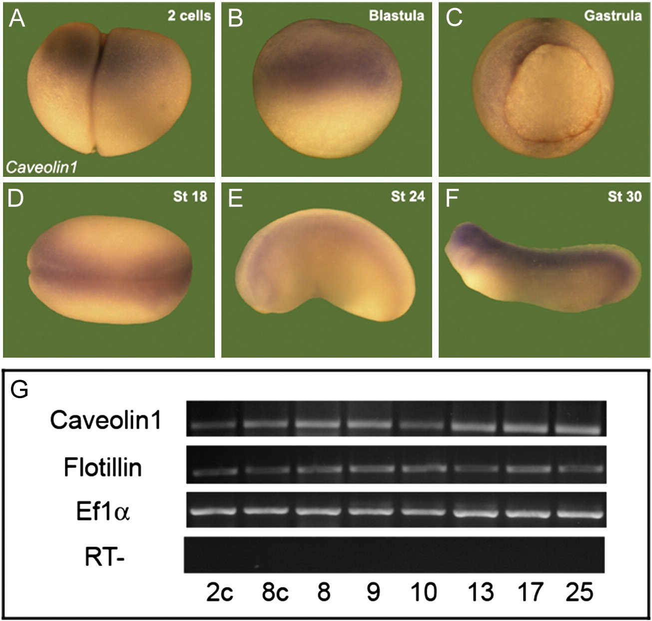 Fig. S1. Caveolin1 and Flotillin are detected very early in Xenopus development. Xenopus in situ hybridization for Caveolin1 shows expression from the 2-cell stage and the blastula in the animal pole (A, B). At the gastrula, neurula and tailbud stages, the transcripts are detected in the dorsal region of the embryo (C). RT-PCR shows the expression of Caveolin1 and Flotillin from the 2-cell to the tailbud stages (G), where the transcripts are detected in all stages. EF1α was used as a RNA loading control. In RT- the reverse transcriptase was omitted. Stages 2c, two-cells, 8c, eight cells and stages 8 to 25. |