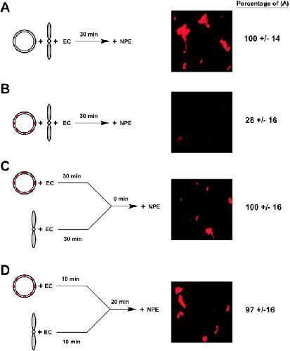 Figure 2. The block to replication of sperm chromatin is dependent on when the sperm chromatin is exposed to the damaged plasmid. (A) Undamaged plasmid DNA or (B–D) MMS-treated plasmid DNA was mixed with egg cytosol (EC) at 3 ng/μl. In A and B, the plasmids were incubated together with the sperm chromatin (2,000/μl in all cases) for the entire 30-min incubation in EC. In C, the plasmid and sperm chromatin were incubated separately in EC and combined just before addition of NPE. In D, the plasmid and sperm chromatin samples were incubated separately in EC for 10 min, and combined for 20 min before addition of NPE. After a 30-min incubation in NPE, replication of sperm chromatin was assessed as in Fig. 1. The micrographs show representative results from each experiment, and the numbers (±1 SD) refer to quantification of the fluorescence intensity data (see Fig. 1 D, for a description of the quantification). The average fluorescent signal intensity value for A was arbitrarily set to 100, and the other values adjusted accordingly. |
