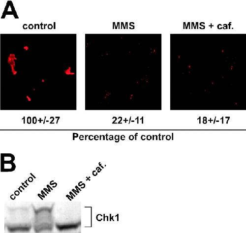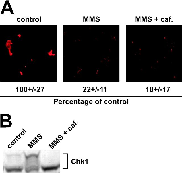 Figure 6. Checkpoint-independent activation of the replication arrest pathway. (A) Either undamaged, control plasmid (3 ng/μl, control lane), or damaged plasmid (3 ng/μl, MMS and MMS + caf. lanes) was added along with 2,000/μl sperm chromatin to egg cytosol. In addition, 5 mM caffeine was added to one of the samples receiving the MMS-treated plasmid (MMS + caf lane). After a 30-min incubation, NPE was added. After an additional 30-min incubation, replication was assessed as in Fig. 1. (B) Reactions identical to those presented in A were set up, and 35S-labeled Chk1 protein was added. After incubation in NPE, the samples were recovered and fractionated on SDS-PAGE gels to visualize the phosphorylation-induced Chk1 mobility shift. The gels were fixed and dried, and exposed to film to detect Chk1. The radio-labeled Chk1 protein was produced by coupled transcription/translation of the full-length Xenopus Chk1 cDNA in rabbit reticulocyte lysates in the presence of 35S-labeled methionine. |