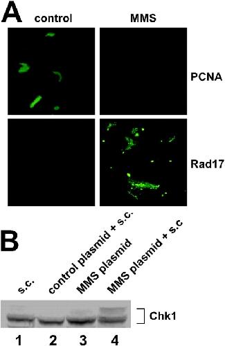 Figure 7. Amplification of the checkpoint signal through replication arrest on undamaged DNA. (A) 2,000/μl sperm chromatin was mixed together with either control plasmid, or MMS-treated plasmid, in egg cytosol for 30 min before the addition of NPE. 30 min after NPE addition, the sperm chromatin templates were fixed and stained with antibodies against either PCNA or frog Rad17. The samples were visualized by fluorescence microscopy. Plasmids were included at a concentration of 3 ng/μl. (B) Egg cytosol containing 35S-labeled Chk1 was mixed with sperm chromatin (lane 1), or sperm chromatin plus control plasmid (lane 2), or MMS-treated plasmid (lane 3), or MMS-treated plasmid plus sperm chromatin (lane 4). After a 30-min incubation, NPE was added and incubation was continued for an additional 30 min. The phosphorylation status of Chk1 was determined by migration on SDS-PAGE as in Fig. 6 B. Plasmids were included at a concentration of 3 ng/μl. |